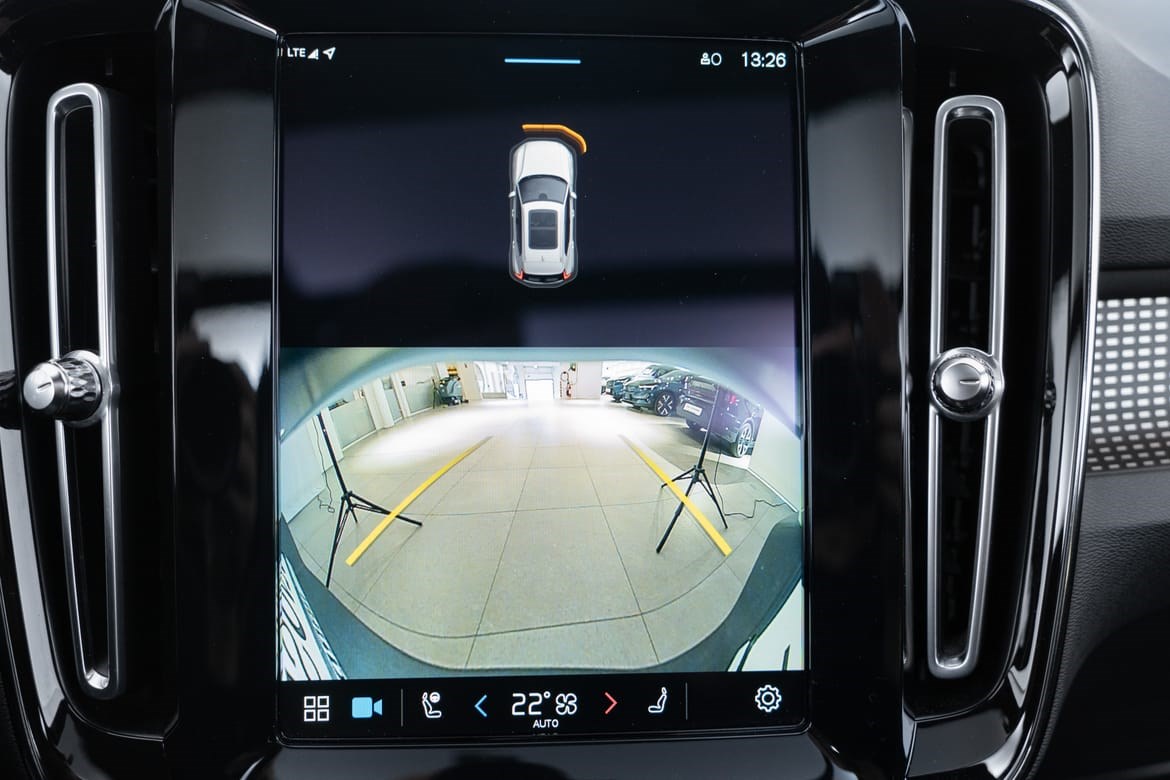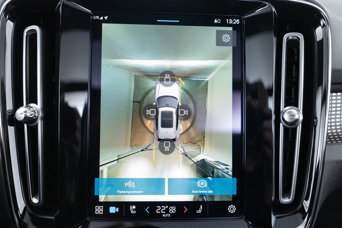 - kamerateknologien viser deg Volvoen din og omgivelsene i høy oppløsing i fugleperspektiv – svært nyttig når du rygger eller manøvrerer på trange steder med begrenset sikt. Systemet bruker fire kameraer: to ved sidespeilene, ett i fronten og ett bak. Hvis du berører et kamerabilde på senterdisplayet, vises det et bilde fra bare det kameraet. Det bakre kameraet kan også gi deg et forstørret bilde av området rett bak bilen, noe som er særlig praktisk når du kjører med tilhenger.
