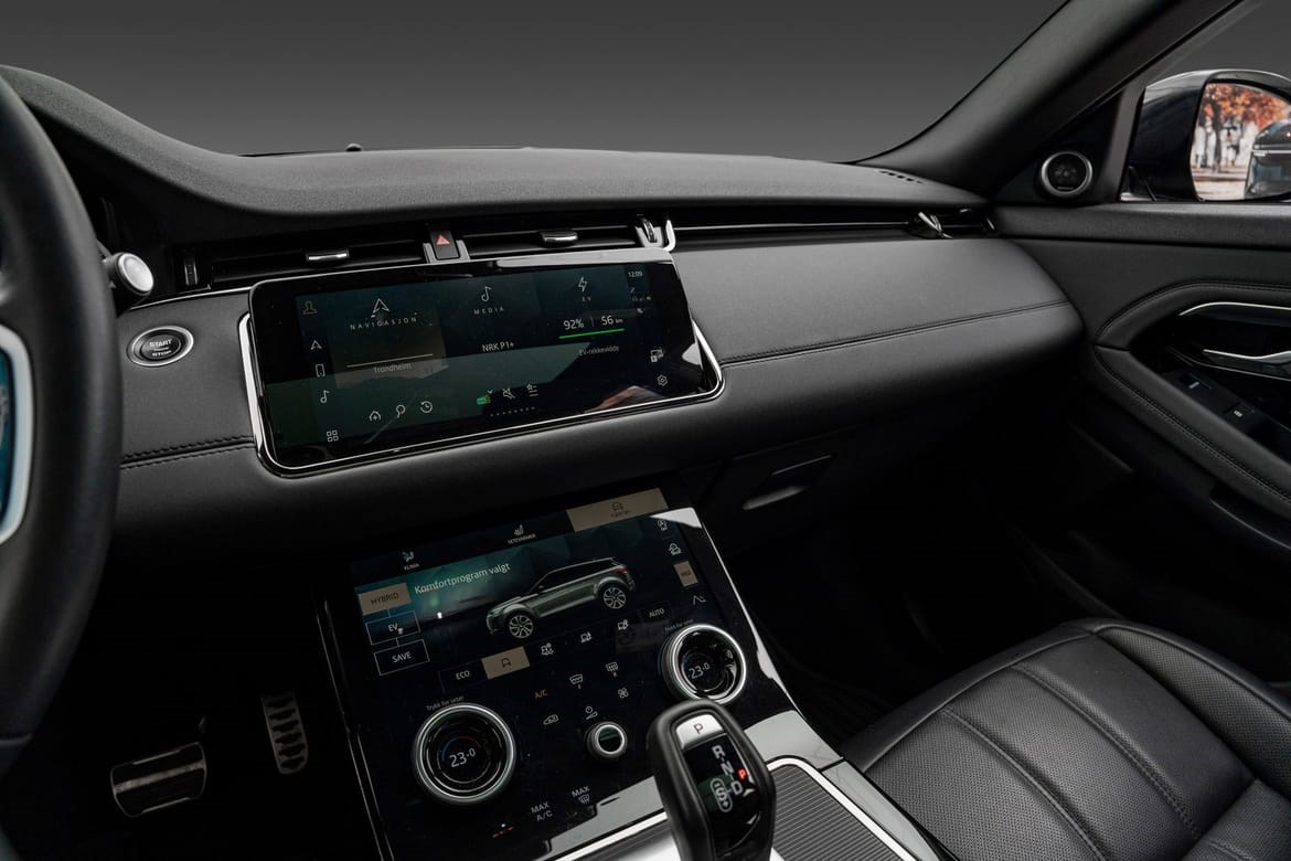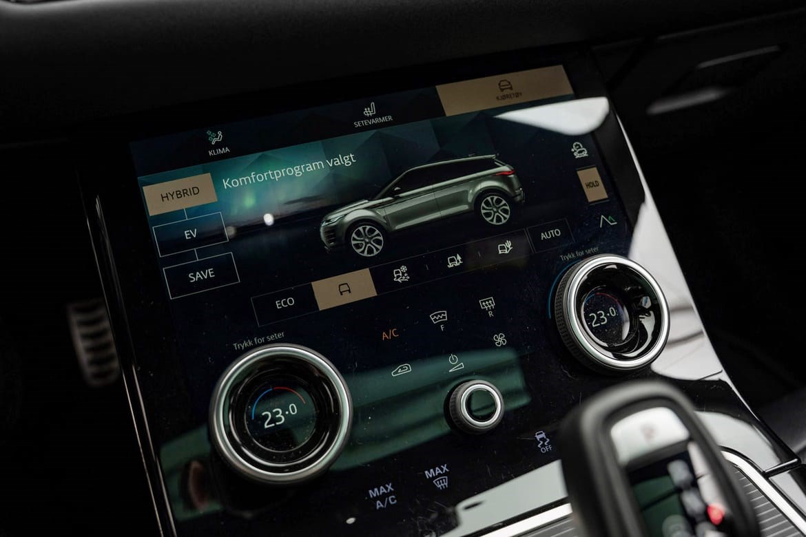 Range Rover Evoque Plugin Hybrid kombinerer en 200HK bensinmotor + elmotor på 109HK som tilsammen yter hele 309HK og har et lavt forbruk. Evoque er også en av veldig få Plug inhybrider som også kan hurtiglade opp til 32kw.