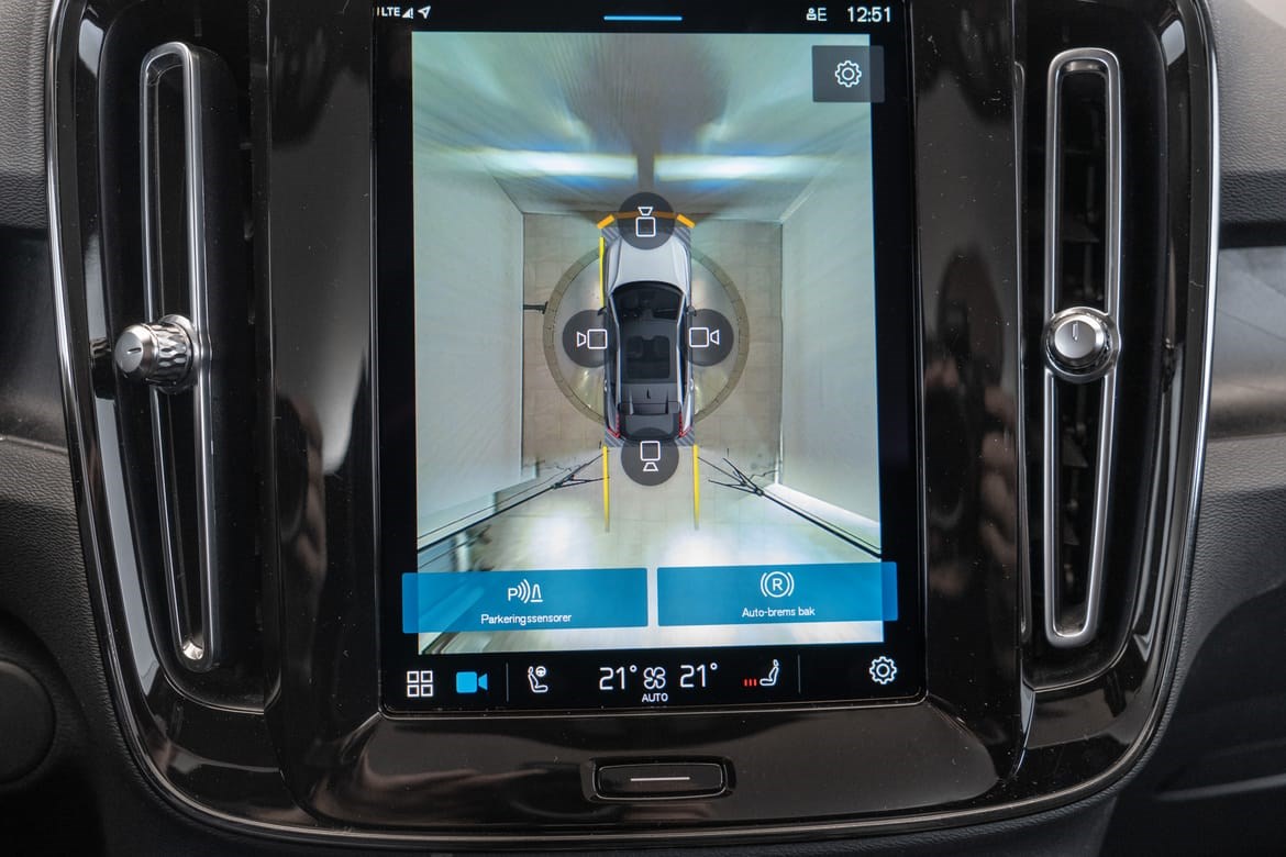 - kamerateknologien viser deg bilen din og omgivelsene i høy oppløsing i fugleperspektiv – svært nyttig når du rygger eller manøvrerer på trange steder med begrenset sikt. Systemet bruker fire kameraer: to ved sidespeilene, ett i fronten og ett bak. Hvis du berører et kamerabilde på senterdisplayet, vises det et bilde fra bare det kameraet. Det bakre kameraet kan også gi deg et forstørret bilde av området rett bak bilen, noe som er særlig praktisk når du kjører med tilhenger.