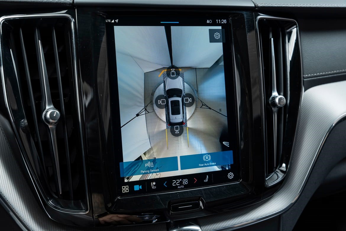 - kamerateknologien viser deg Volvoen din og omgivelsene i høy oppløsing i fugleperspektiv – svært nyttig når du rygger eller manøvrerer på trange steder med begrenset sikt. Systemet bruker fire kameraer: to ved sidespeilene, ett i fronten og ett bak. Hvis du berører et kamerabilde på senterdisplayet, vises det et bilde fra bare det kameraet. Det bakre kameraet kan også gi deg et forstørret bilde av området rett bak bilen, noe som er særlig praktisk når du kjører med tilhenger.