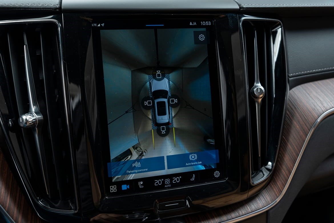 - kamerateknologien viser deg Volvoen din og omgivelsene i høy oppløsing i fugleperspektiv – svært nyttig når du rygger eller manøvrerer på trange steder med begrenset sikt. Systemet bruker fire kameraer: to ved sidespeilene, ett i fronten og ett bak. Hvis du berører et kamerabilde på senterdisplayet, vises det et bilde fra bare det kameraet. Det bakre kameraet kan også gi deg et forstørret bilde av området rett bak bilen, noe som er særlig praktisk når du kjører med tilhenger.