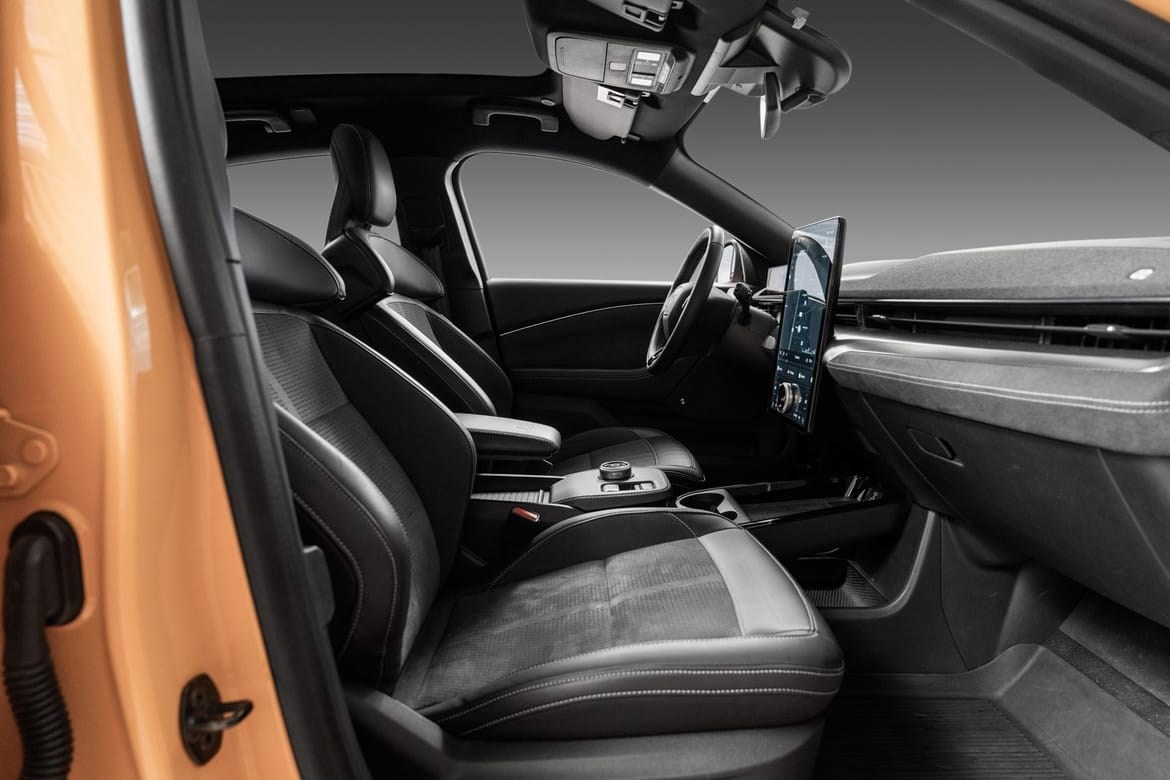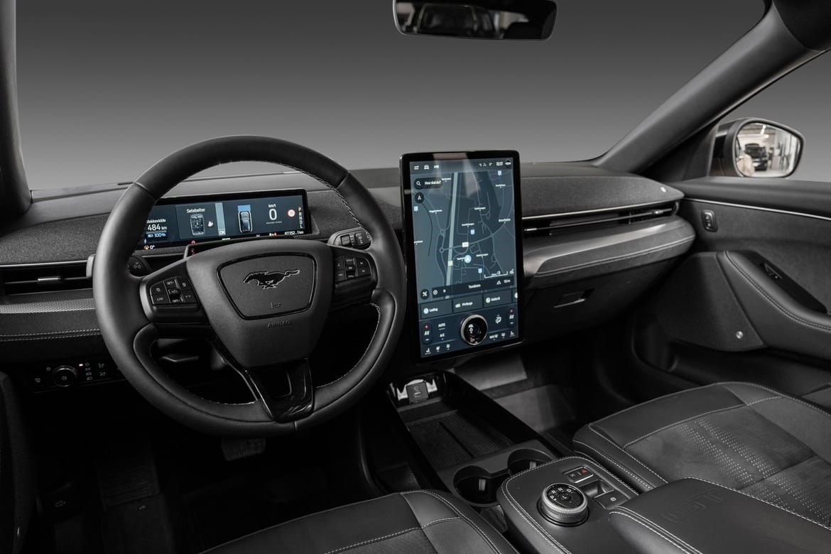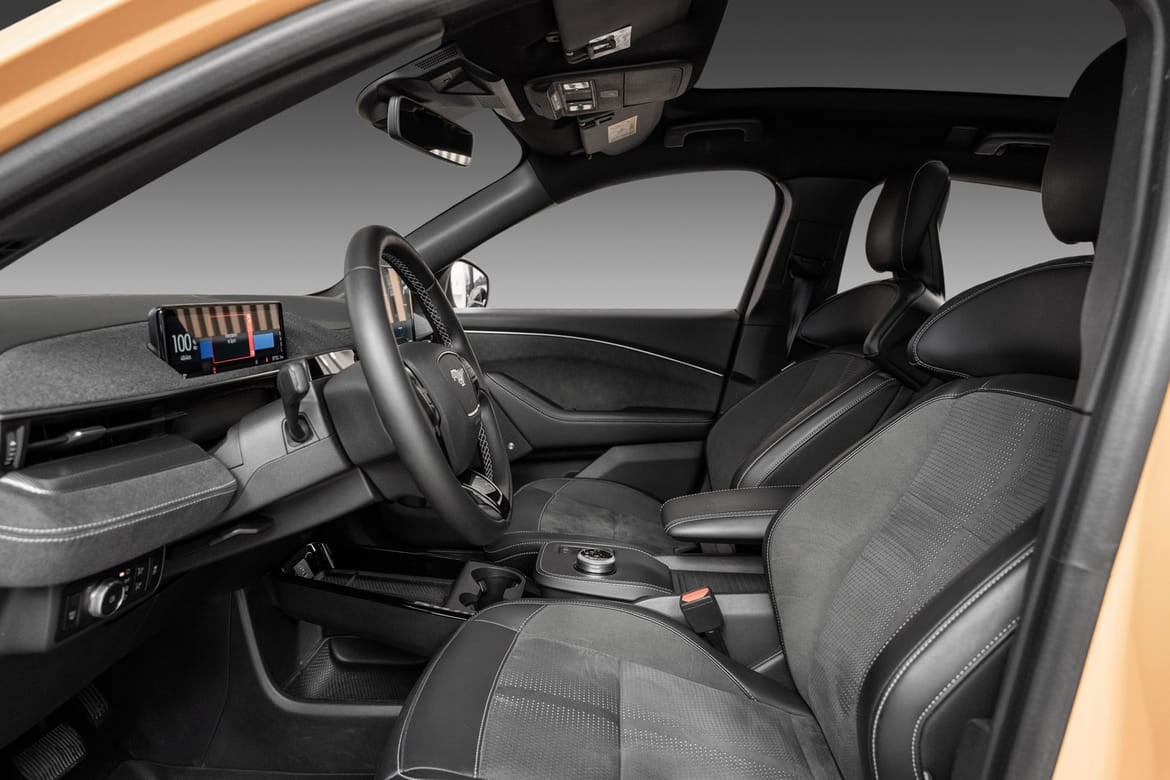 Mach-E GT har et sportslig og kraftfullt design, med unike detaljer som gir den en tydelig GT-identitet – inkludert spesifikke frontdetaljer, 20-tommers felger og sportsseter. Interiøret er preget av rene linjer, kvalitetsmaterialer og en stor 15,5-tommers sentral berøringsskjerm med Fords SYNC 4A infotainmentsystem. Plassforholdene er romslige, og bagasjerommet foran (frunk) gir ekstra fleksibilitet.
