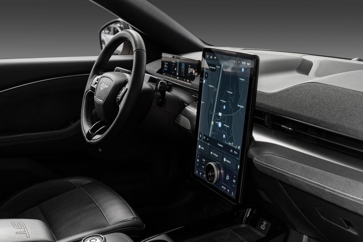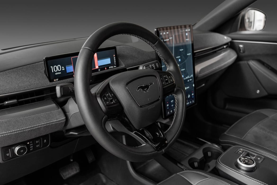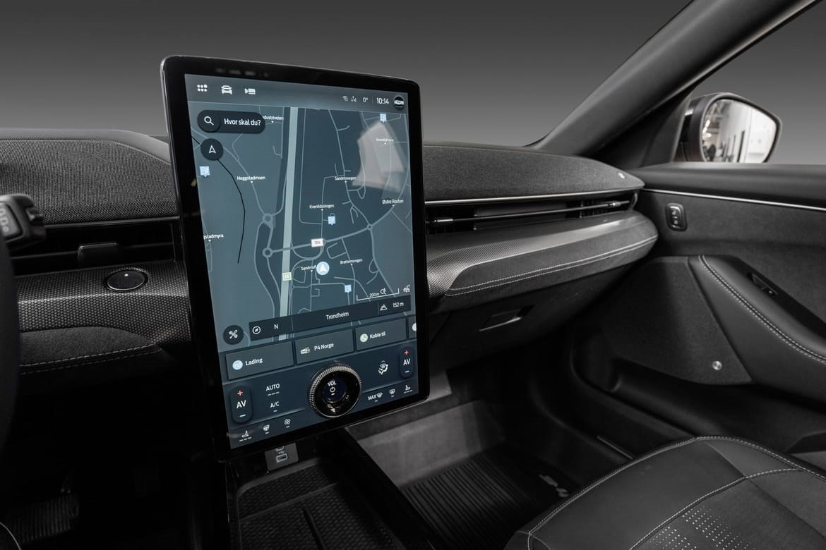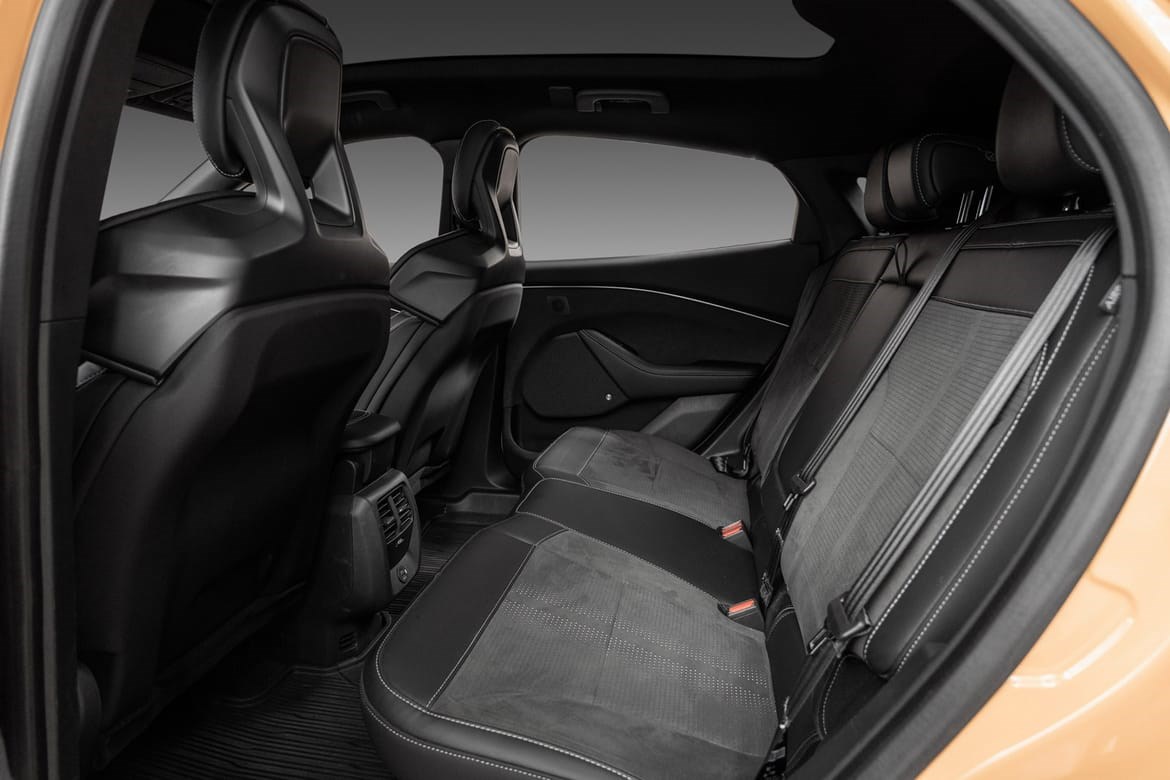 Mach-E GT har et sportslig og kraftfullt design, med unike detaljer som gir den en tydelig GT-identitet – inkludert spesifikke frontdetaljer, 20-tommers felger og sportsseter. Interiøret er preget av rene linjer, kvalitetsmaterialer og en stor 15,5-tommers sentral berøringsskjerm med Fords SYNC 4A infotainmentsystem. Plassforholdene er romslige, og bagasjerommet foran (frunk) gir ekstra fleksibilitet.