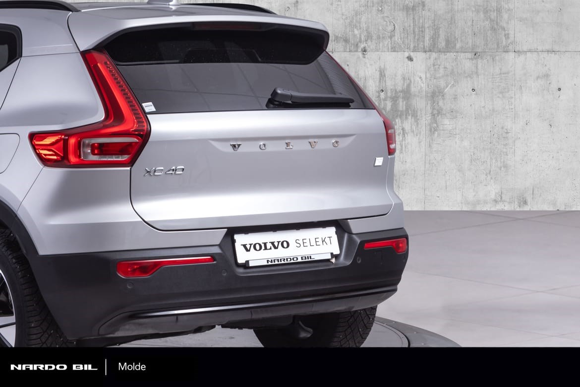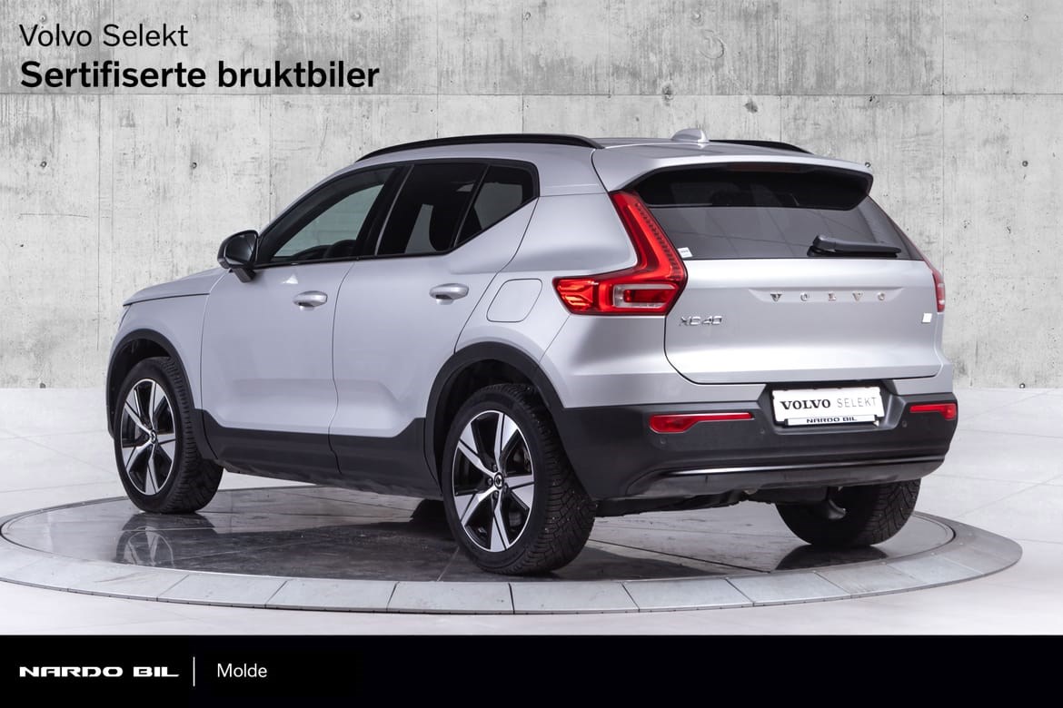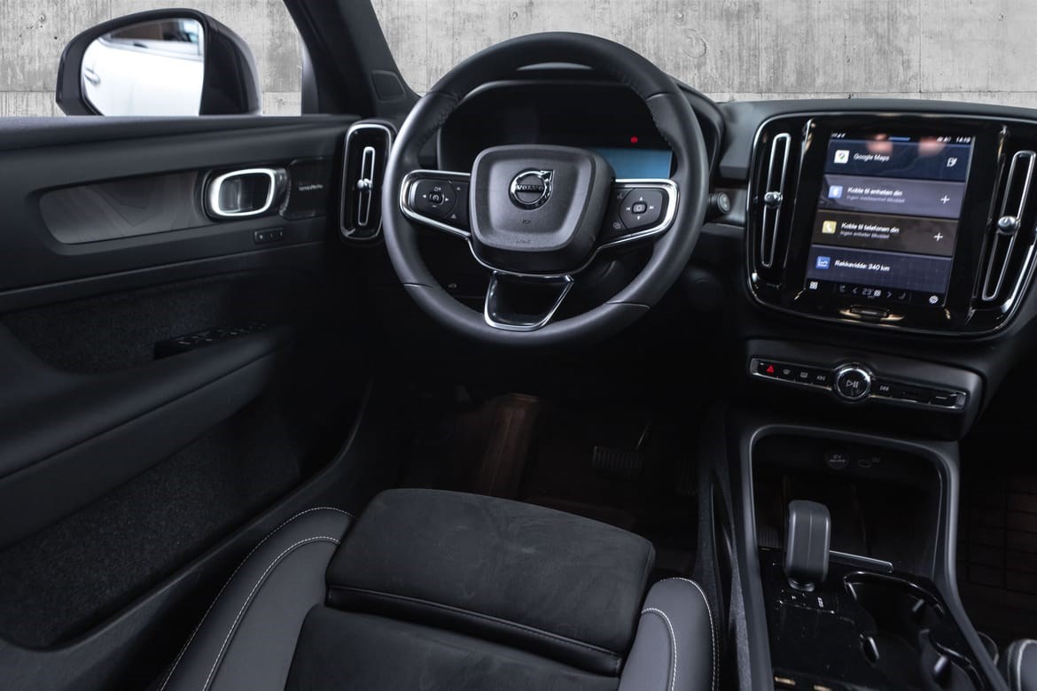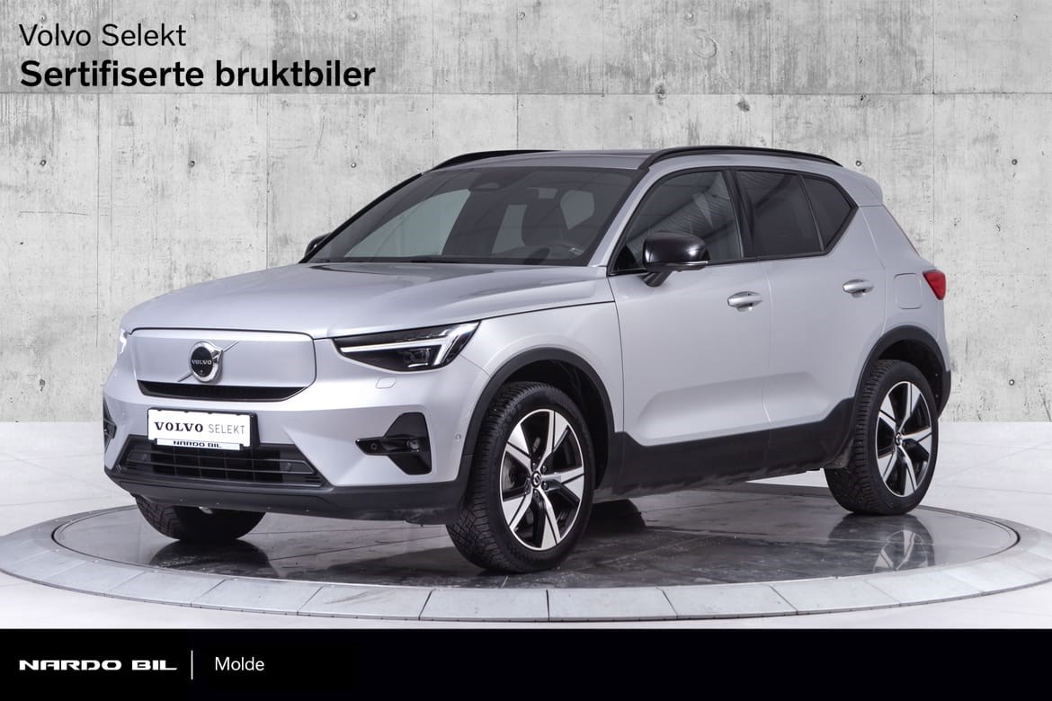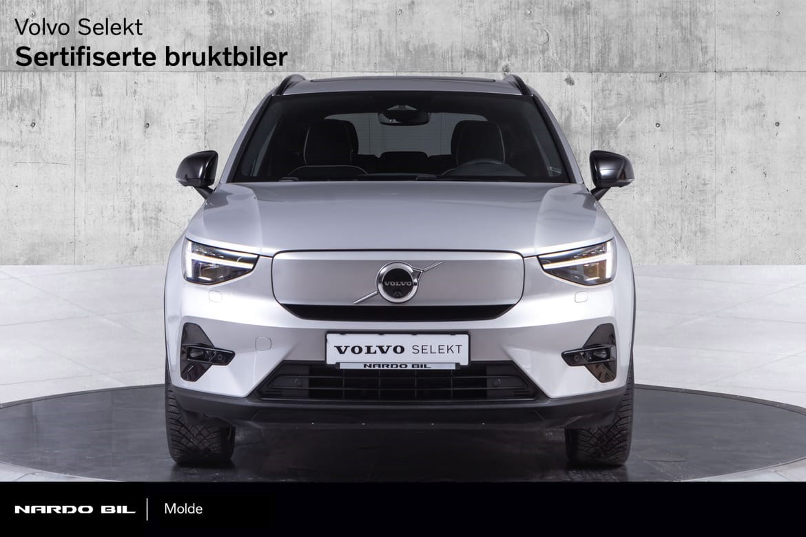 Hel-elektriske XC40 er i den fine fargen Silver Dawn Metallic med sorte Delskinn seter. Denne kommer med el-motor med god og tilstrekkelig tytelse på 408hk med firehjulstrekk.