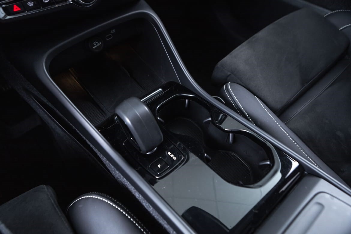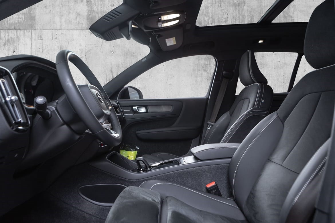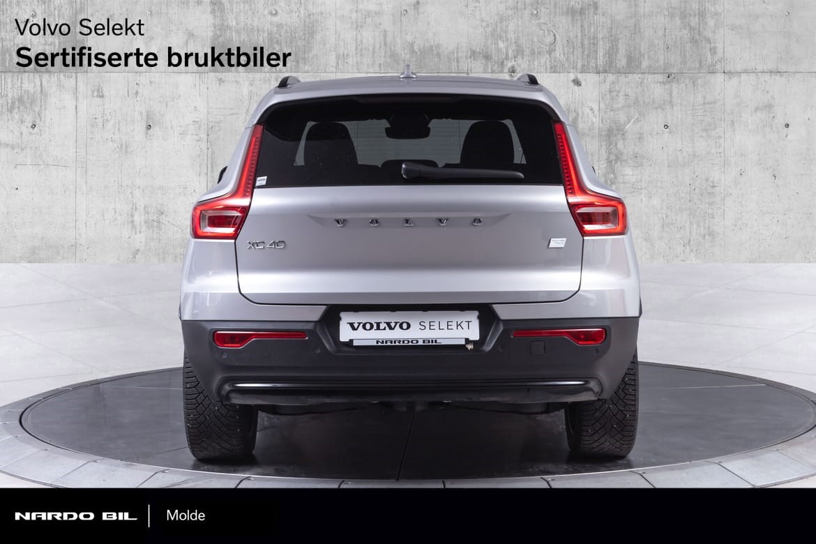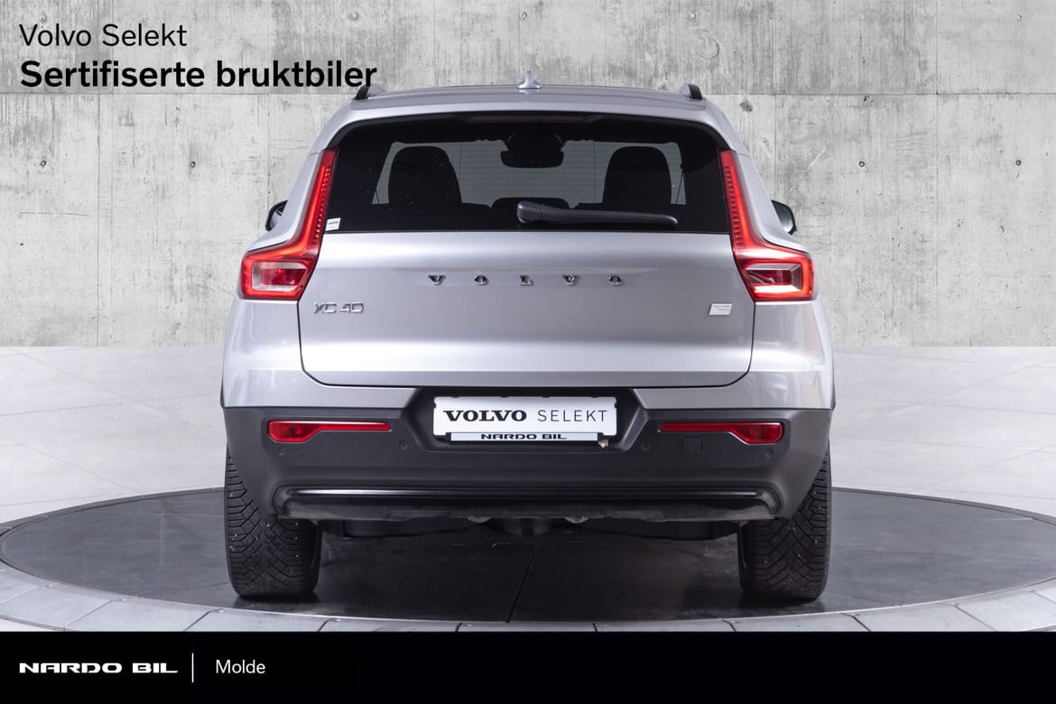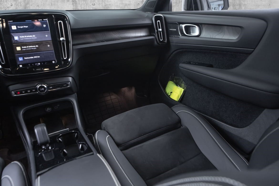 Hel-elektriske XC40 er i den fine fargen Silver Dawn Metallic med sorte Delskinn seter. Denne kommer med el-motor med god og tilstrekkelig tytelse på 408hk med firehjulstrekk.