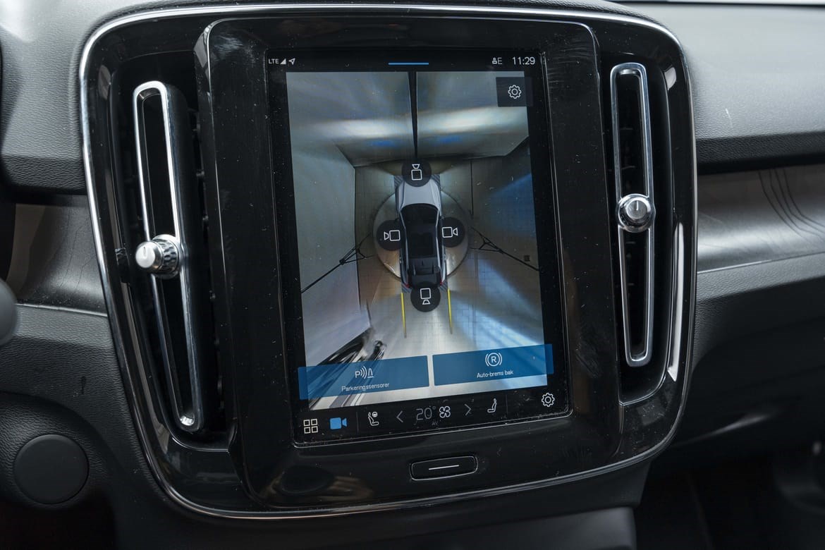 - kamerateknologien viser deg bilen din og omgivelsene i høy oppløsing i fugleperspektiv – svært nyttig når du rygger eller manøvrerer på trange steder med begrenset sikt. Systemet bruker fire kameraer: to ved sidespeilene, ett i fronten og ett bak. Hvis du berører et kamerabilde på senterdisplayet, vises det et bilde fra bare det kameraet. Det bakre kameraet kan også gi deg et forstørret bilde av området rett bak bilen, noe som er særlig praktisk når du kjører med tilhenger.