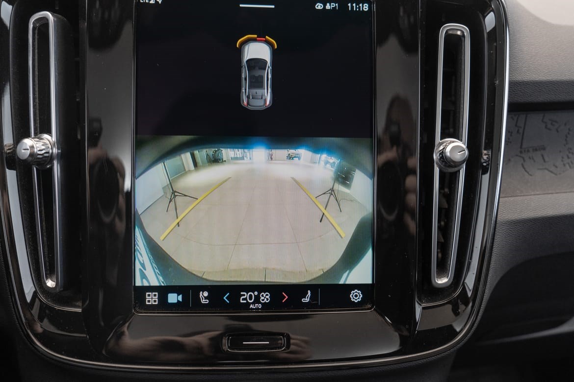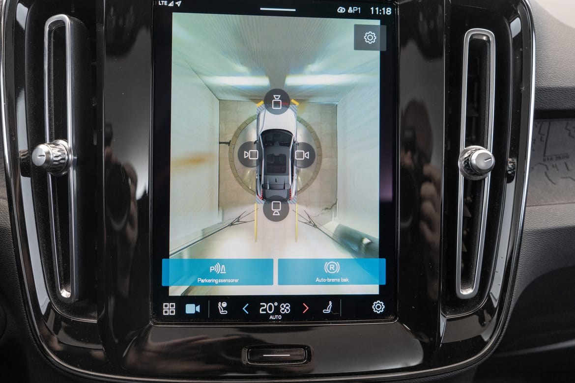 - kamerateknologien viser deg Volvoen din og omgivelsene i høy oppløsing i fugleperspektiv – svært nyttig når du rygger eller manøvrerer på trange steder med begrenset sikt. Systemet bruker fire kameraer: to ved sidespeilene, ett i fronten og ett bak. Hvis du berører et kamerabilde på senterdisplayet, vises det et bilde fra bare det kameraet. Det bakre kameraet kan også gi deg et forstørret bilde av området rett bak bilen, noe som er særlig praktisk når du kjører med tilhenger.