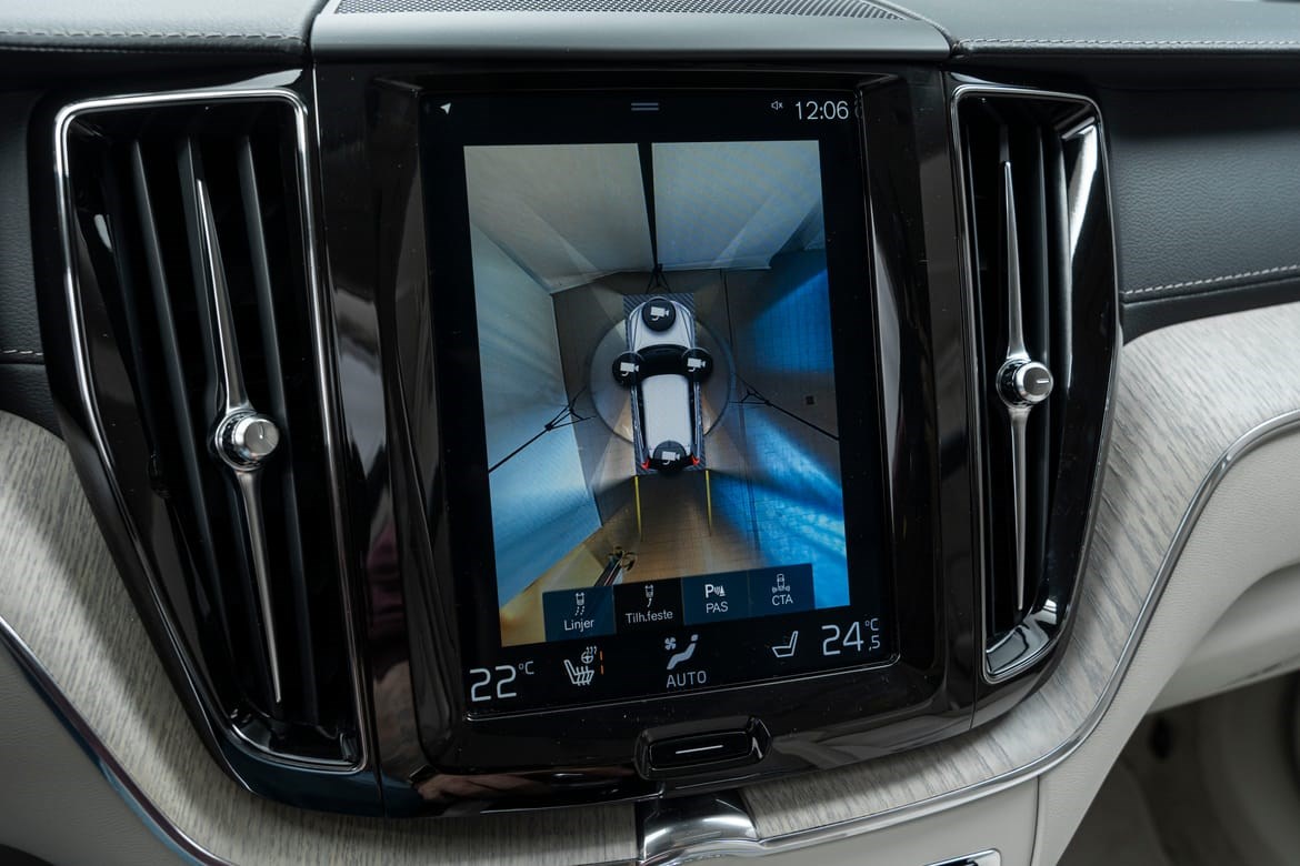 - kamerateknologien viser deg Volvoen din og omgivelsene i høy oppløsing i fugleperspektiv – svært nyttig når du rygger eller manøvrerer på trange steder med begrenset sikt. Systemet bruker fire kameraer: to ved sidespeilene, ett i fronten og ett bak. Hvis du berører et kamerabilde på senterdisplayet, vises det et bilde fra bare det kameraet. Det bakre kameraet kan også gi deg et forstørret bilde av området rett bak bilen, noe som er særlig praktisk når du kjører med tilhenger.