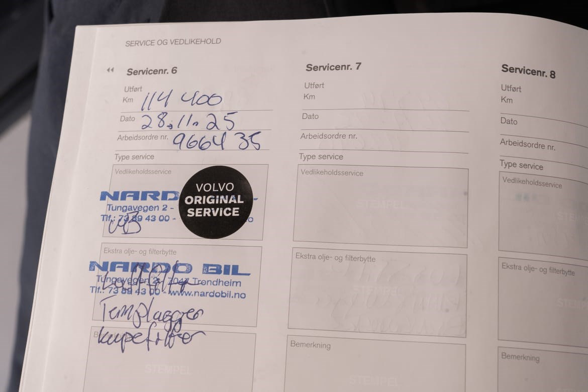 Denne bilen har fått førsteklasses oppfølging gjennom hele sitt livsløp. Alle servicer er utført hos autorisert Volvo-forhandler, i henhold til fabrikkens anbefalte serviceprogram. Det betyr at bilen er vedlikeholdt med originale deler, riktig kompetanse og oppdatert programvare – akkurat slik Volvo har designet den for optimal sikkerhet, ytelse og verdi.