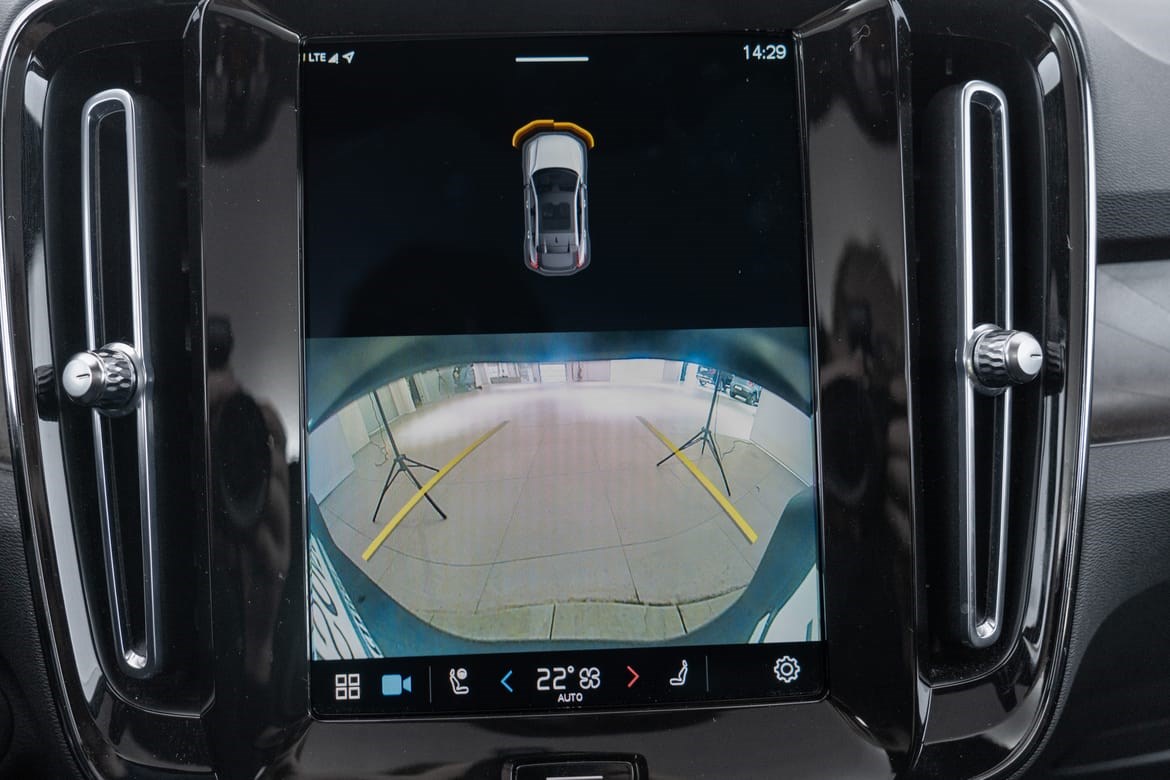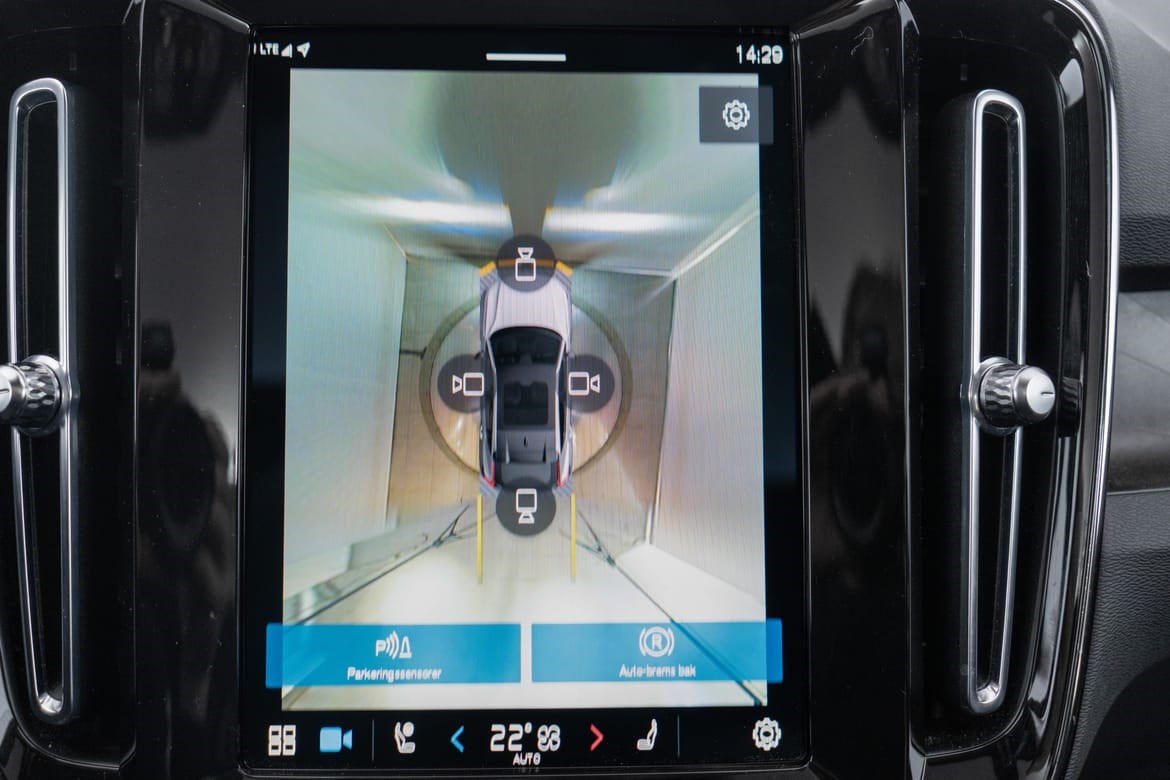 - kamerateknologien viser deg bilen din og omgivelsene i høy oppløsing i fugleperspektiv – svært nyttig når du rygger eller manøvrerer på trange steder med begrenset sikt. Systemet bruker fire kameraer: to ved sidespeilene, ett i fronten og ett bak. Hvis du berører et kamerabilde på senterdisplayet, vises det et bilde fra bare det kameraet. Det bakre kameraet kan også gi deg et forstørret bilde av området rett bak bilen, noe som er særlig praktisk når du kjører med tilhenger.