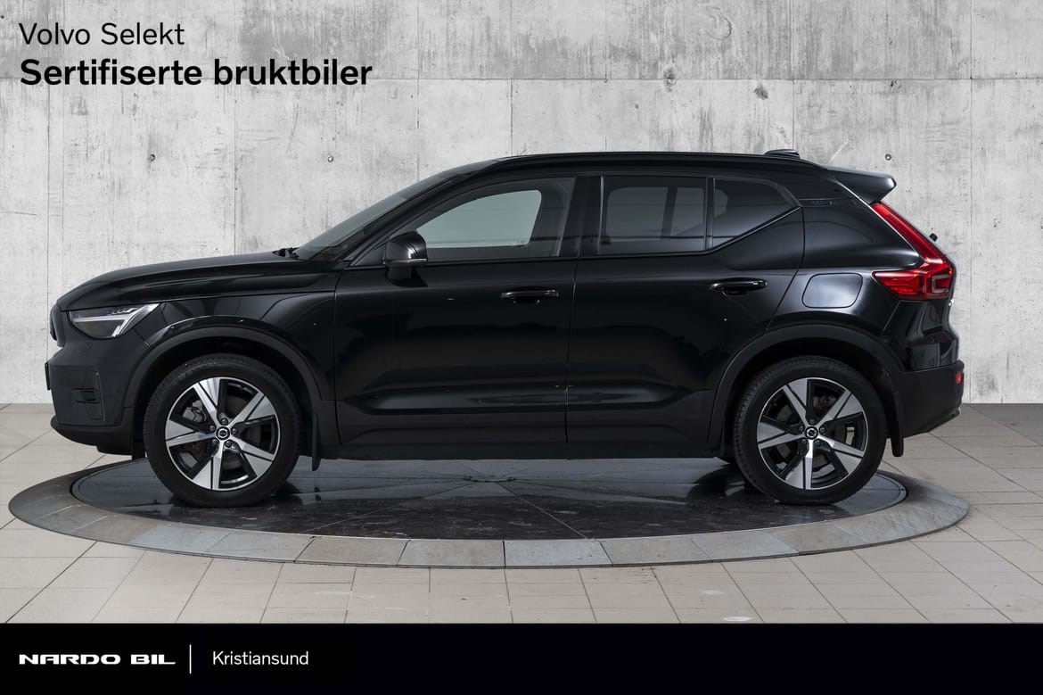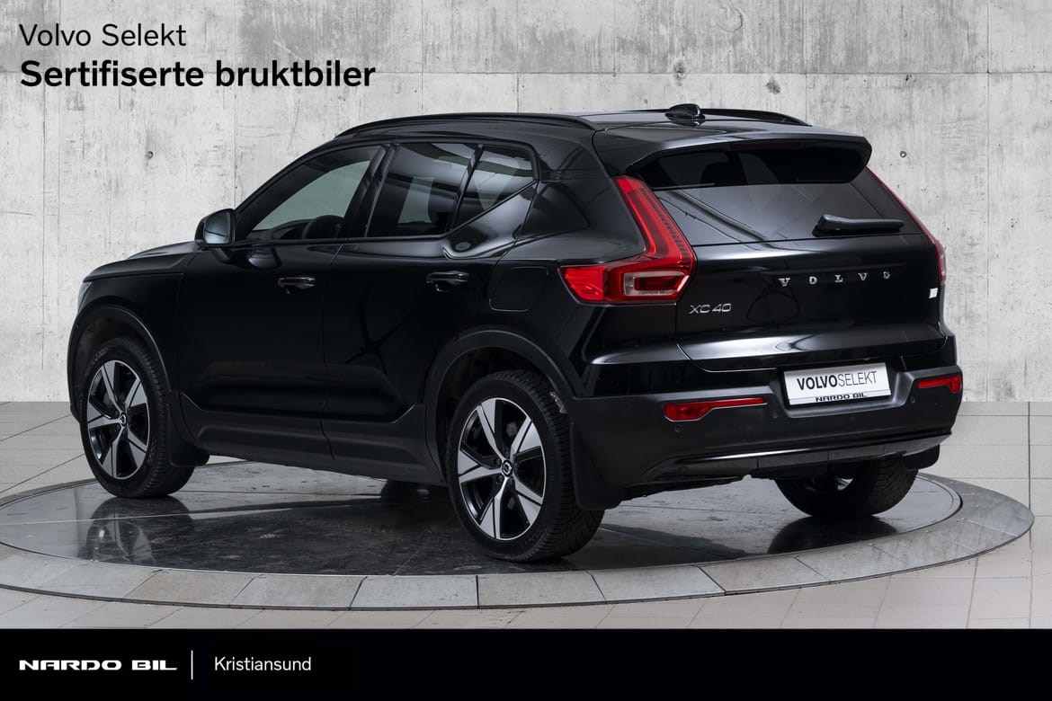 Den helelektriske Volvo XC40 kombinerer kraft, luksus og sikkerhet i en urban SUV-pakke. Med en imponerende elektrisk motor som leverer 408 hk og permanent firehjulstrekk, får du både kjøreglede og trygghet i toppklasse. Bilen byr på romslig plass og den velkjente Volvo-sikkerheten, samtidig som den leverer en elektrisk rekkevidde på opptil 417 km (WLTP) takket være en batterikapasitet på 78 kWh. På lengre turer sørger hurtiglading for at batteriet lades fra 20 % til 80 % på bare 40 minutter (med opptil 150 kW).