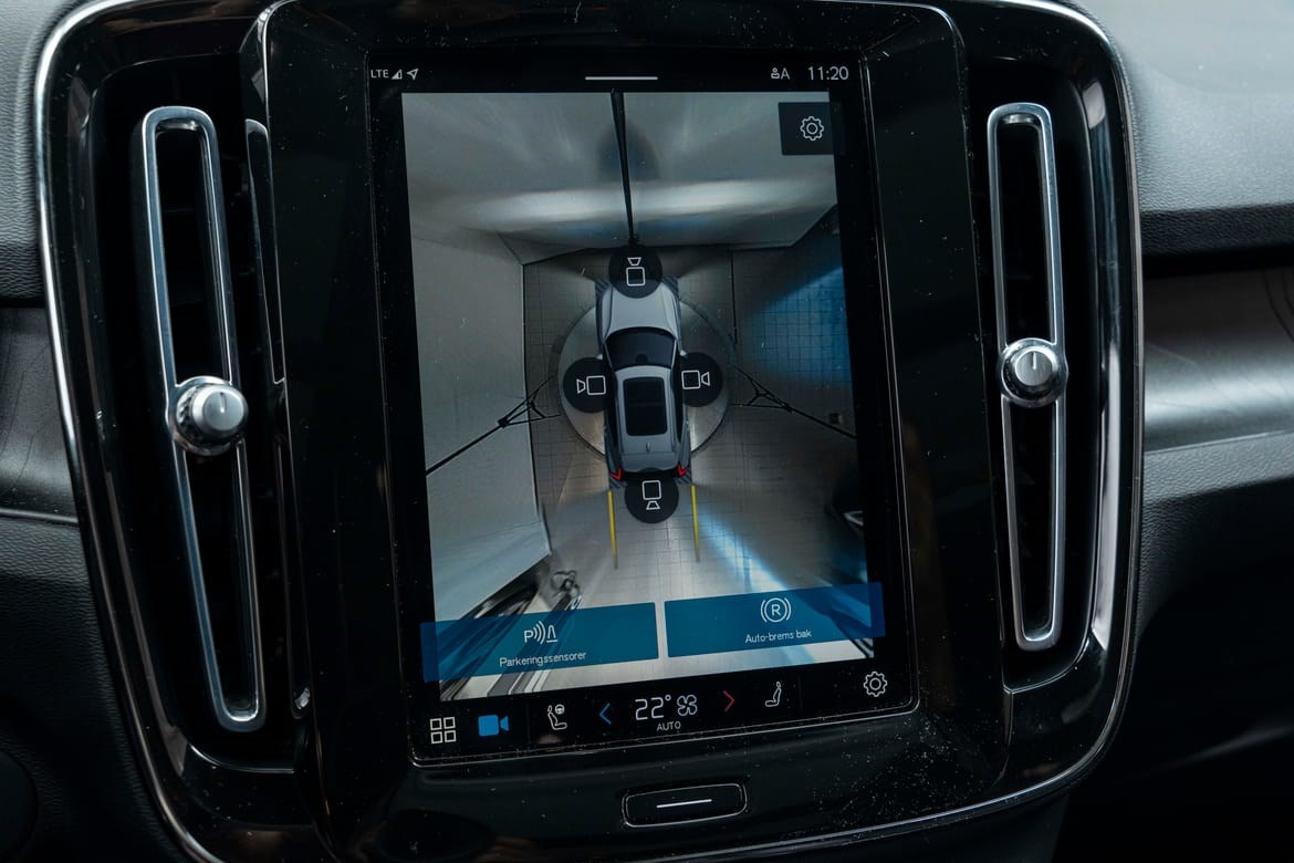 - kamerateknologien viser deg bilen din og omgivelsene i høy oppløsing i fugleperspektiv – svært nyttig når du rygger eller manøvrerer på trange steder med begrenset sikt. Systemet bruker fire kameraer: to ved sidespeilene, ett i fronten og ett bak. Hvis du berører et kamerabilde på senterdisplayet, vises det et bilde fra bare det kameraet. Det bakre kameraet kan også gi deg et forstørret bilde av området rett bak bilen, noe som er særlig praktisk når du kjører med tilhenger.