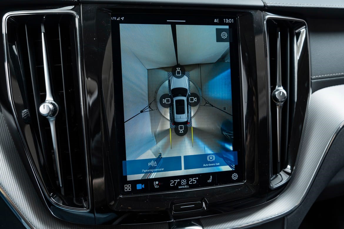 - kamerateknologien viser deg Volvoen din og omgivelsene i høy oppløsing i fugleperspektiv – svært nyttig når du rygger eller manøvrerer på trange steder med begrenset sikt. Systemet bruker fire kameraer: to ved sidespeilene, ett i fronten og ett bak. Hvis du berører et kamerabilde på senterdisplayet, vises det et bilde fra bare det kameraet. Det bakre kameraet kan også gi deg et forstørret bilde av området rett bak bilen, noe som er særlig praktisk når du kjører med tilhenger.
