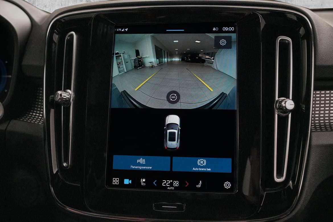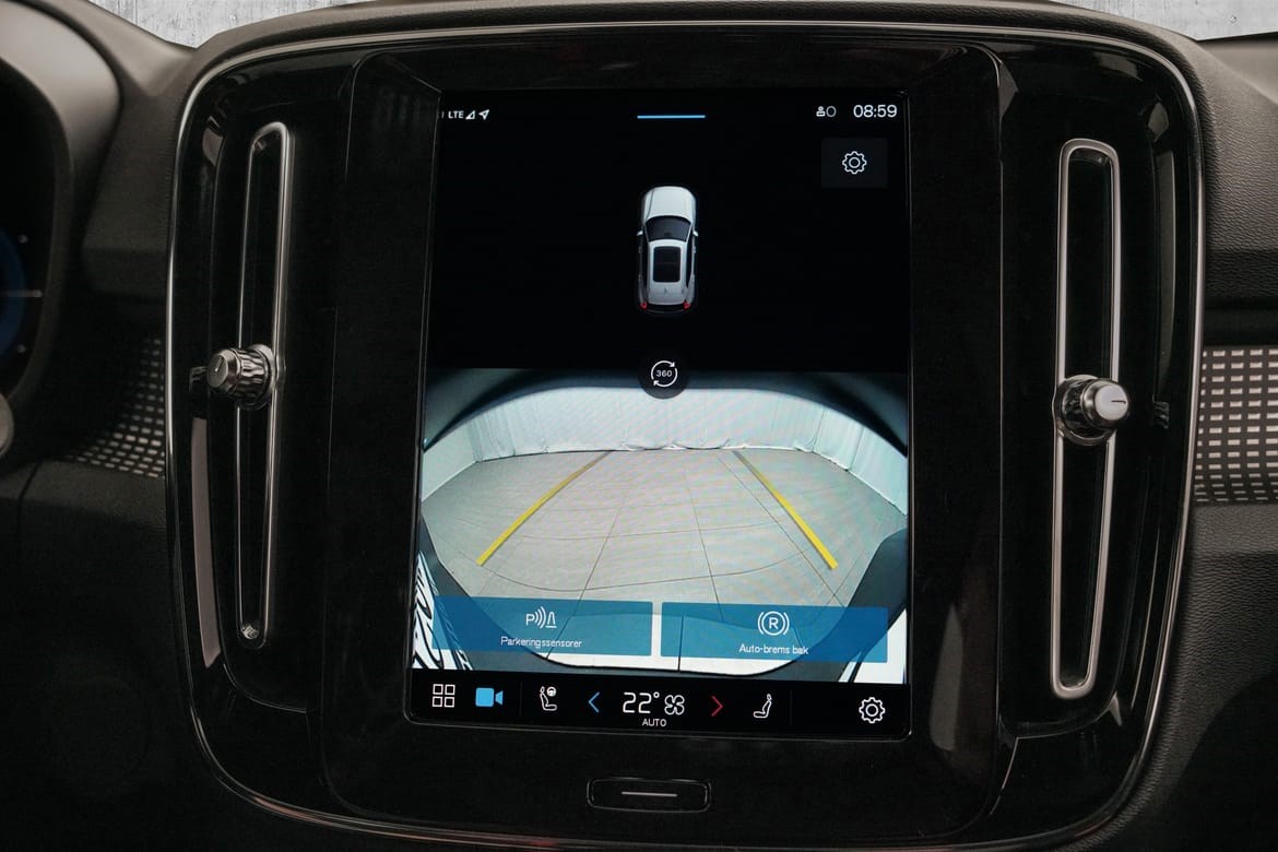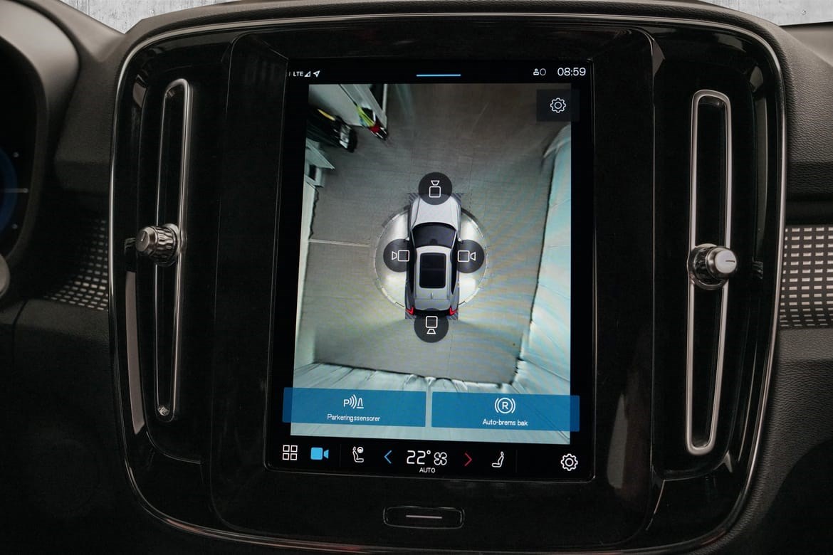 • Kamerateknologien viser deg bilen din og omgivelsene i høy oppløsing i fugleperspektiv – svært nyttig når du rygger eller manøvrerer på trange steder med begrenset sikt. Systemet bruker fire kameraer: to ved sidespeilene, ett i fronten og ett bak. Hvis du berører et kamerabilde på senterdisplayet, vises det et bilde fra bare det kameraet. Det bakre kameraet kan også gi deg et forstørret bilde av området rett bak bilen, noe som er særlig praktisk når du kjører med tilhenger.