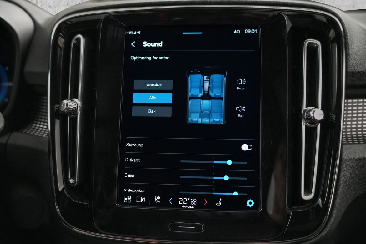 • Lydsystemet av høy klasse leverer vidunderlig balansert, kraftig lyd. De 13 hifi-høyttalerne inkludert en luftventilert subwoofer er drevet av en 600 W digital forsterker og er skreddersydd for akustikken inne i din Volvo så du får en nydelig surround sound-opplevelse. Unik programvare for lydbehandling optimerer høyttalernes respons for å sikre at de er i perfekt harmoni med hverandre. Uansett hvor du sitter, kan du og passasjerene dine glede dere over en sømløs førsteklasses lytteopplevelse under alle forhold og – ikke minst – en ekstremt samkjørt og fet basslyd.
